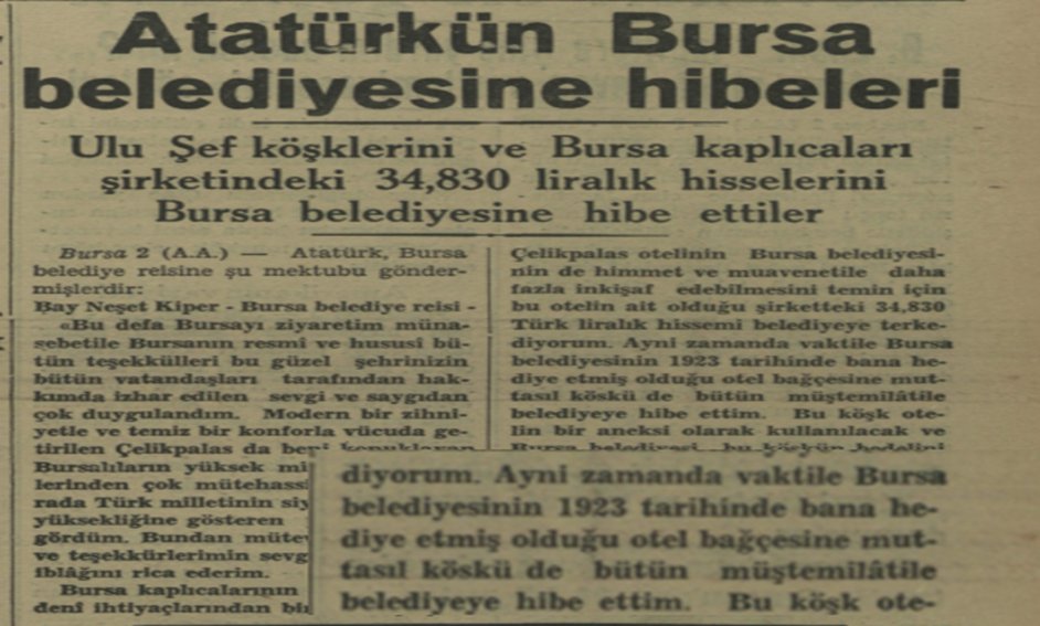Atatürk’ün 20 Ocak 1923 tarihindeki Bursa ziyaretinde kaldığı köşk ise, Bursa Belediyesi tarafından sahibinden satın alınarak kendisine hediye edilmiştir. Atatürk Çelikpalas Oteli’nin bahçesinde bulunan bu köşkü 2 Şubat 1938 tarihinde Bursa Merinos Fabrikasını hizmete açmak için yaptığı Bursa ziyareti esnasında tekrar Bursa Belediyesine bağışlamıştır. Atatürk, Bursa Belediyesine hitaben köşkü ve Bursa kaplıcalarındaki hisselerini bağışladığını bildiren şu mektubu yazmıştır: