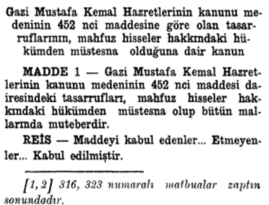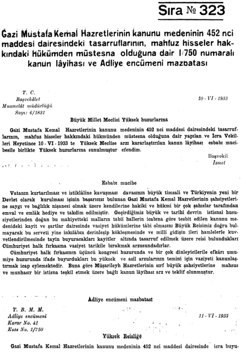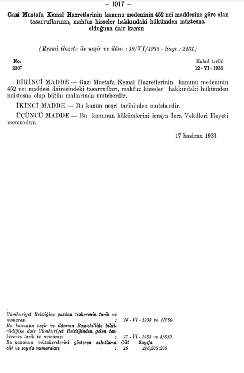 12 Haziran 1933 tarih ve 2307 sayılı kanunla Gazi Mustafa Kemal Hazretleri’nin mallarının mahfuz hisseler hakkındaki hükümden müstesna olduğu hususu hüküm altına alınmıştır.