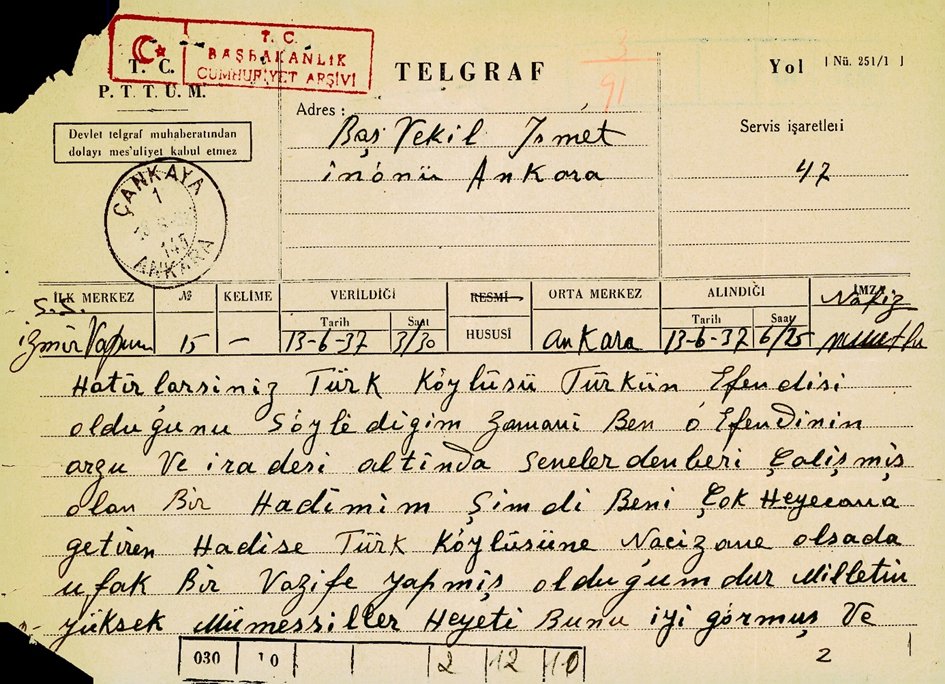 "Hatırlarsınız, Türk köylüsünün Türk’ün efendisi olduğunu söylediğim zamanı. Ben o efendinin isteği ve iradesi altında yıllardan beri çalışmış olan bir hizmetçiyim. Şimdi beni çok duygulandıran olay, değersiz olsa da Türk köylüsüne ufak bir görev yapmış olduğumdur. Milletin Yüksek Temsilciler Kurulu bunu iyi görmüş ve kabul etmişler ise, benim için en unutulmaz bir mutluluk anısını bana vermişlerdir. Bundan ötürü çok yüksek bir zevkle millet, memleket ve Cumhuriyet hükümetine yapmak zorunda olduğum görevlerden en basiti karşısında gösterilmiş olan iyi duygulardan ne kadar heyecanlandığımı anlatacak güçte değilim. Söz konusu olan armağan Yüksek Türk Milletine benim asıl vermeyi düşündüğüm armağan karşısında hiçbir değere sahip değildir. Ben gerektiği zaman en büyük armağanım olmak üzere Türk milletine canımı vereceğim."