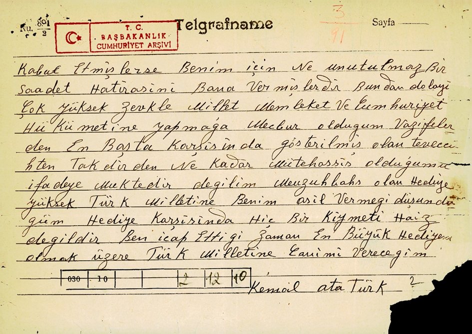 🔟- Atatürk, sahip olduğu çiftlikleri hazineye hediye etmesinden dolayı kendisine hükümet adına teşekkür eden İsmet İnönü’ye gönderdiği cevabî mektupta, çiftliklerini Türk köylüsüne bağışlamanın küçük bir görev olduğunu ve asıl vermeyi düşündüğü armağan karşısında hiçbir değere sahip olmadığını ifade ederek ve asıl vermeyi düşündüğü armağanın canı olduğunu, zamanı geldiğinde zamanı geldiğinde Türk milletine en büyük armağanı olmak üzere canını vereceğini ifade etti.