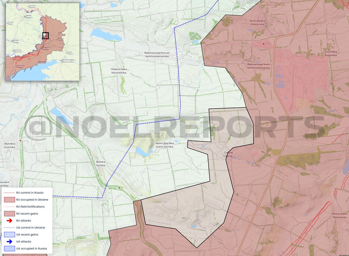 Based on new information, there are a number of changes to the map: Verkhn'okam'yans'ke and Novoselivka appear to be under AFU control (wrongly mapped). Spirne and the approaches east of Ivano-Dar'ivka is under Russian control (new)
