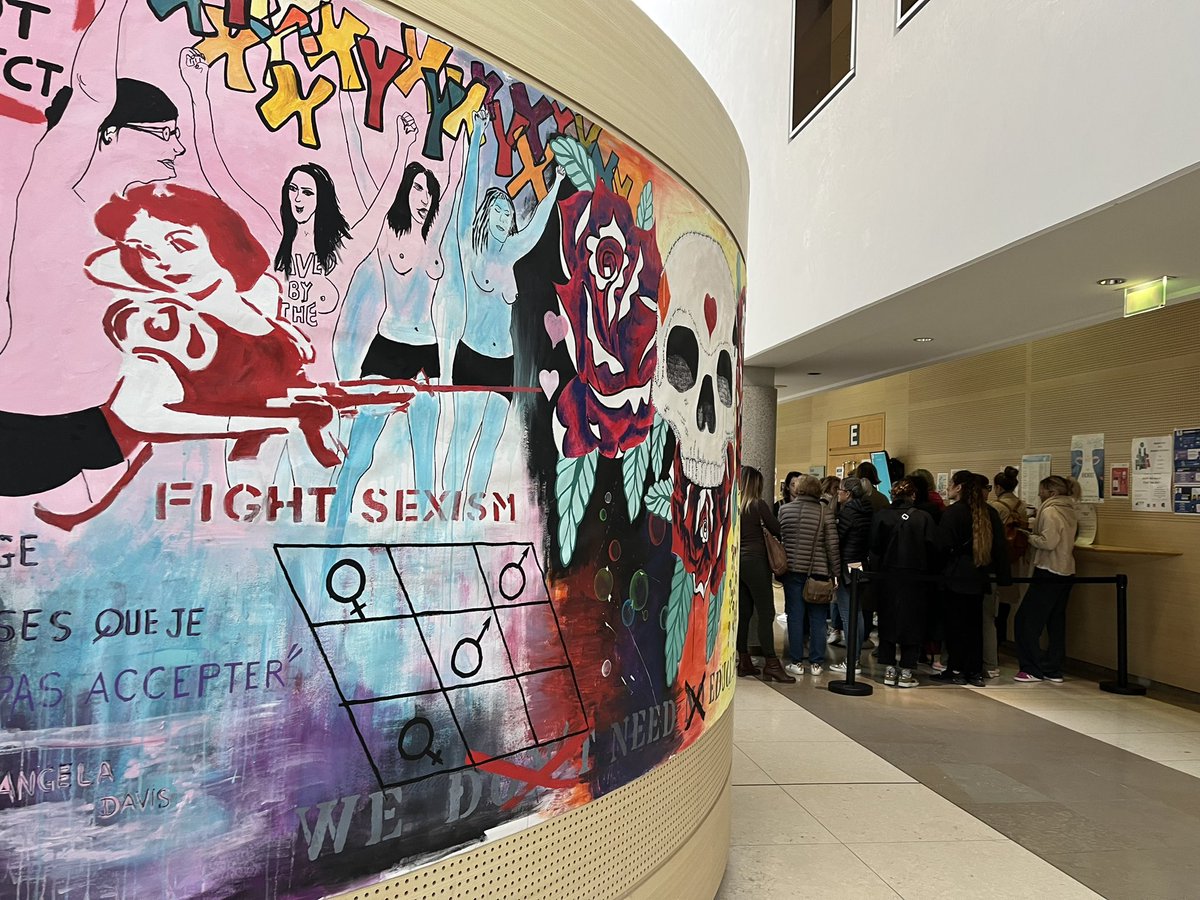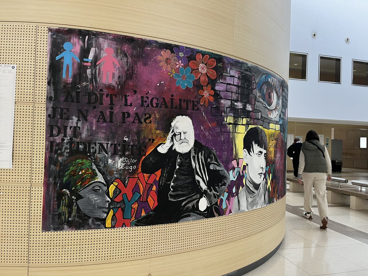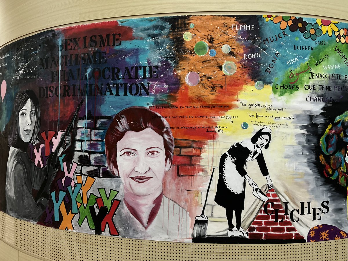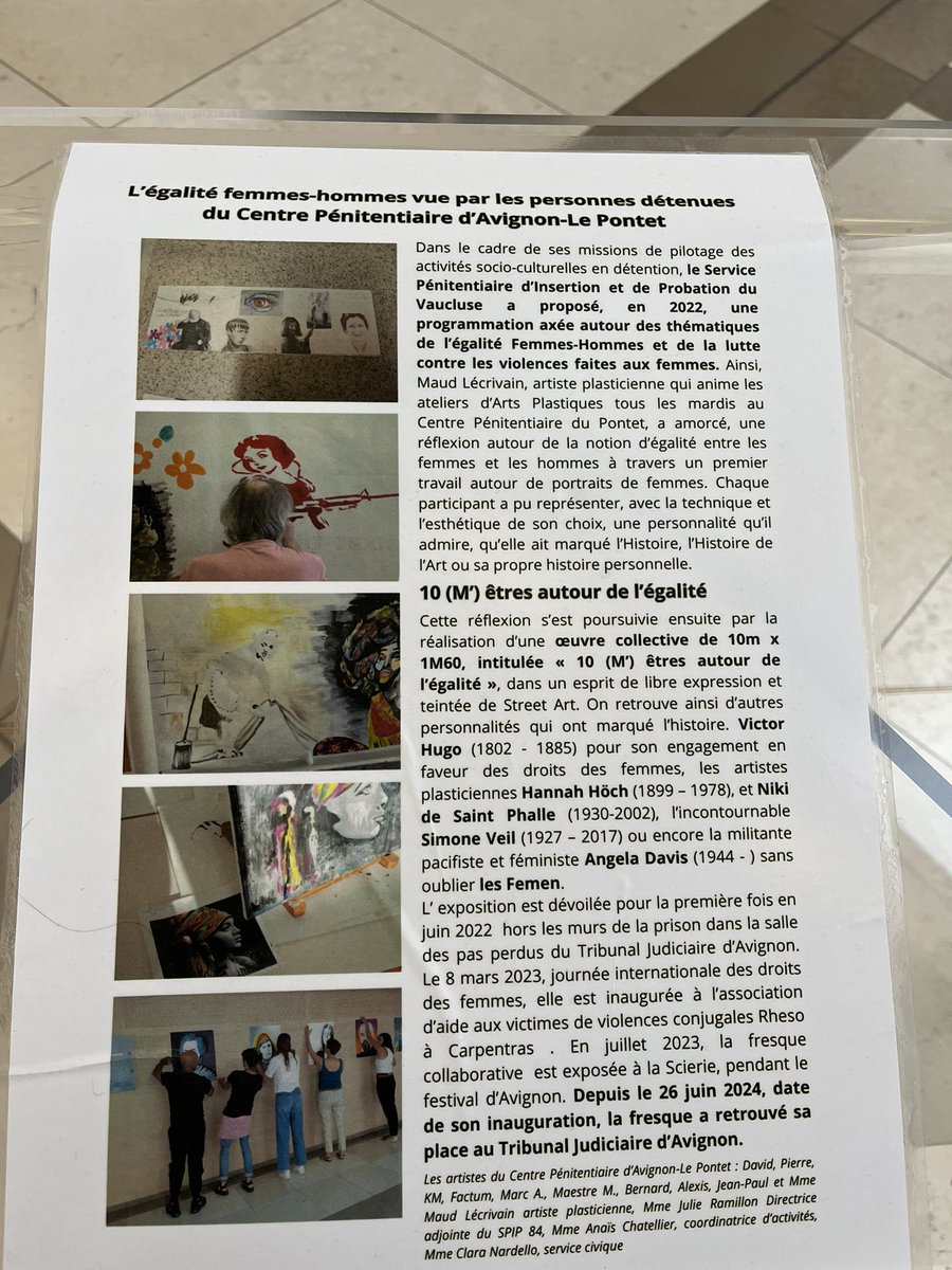 Avant la reprise de l’audience je remarque cette fresque installée sur le murs d’une salle du tribunal la semaine dernière sur l’égalité femmes-hommes vue par les personnes détenues du centre pénitentiaire du Pontet