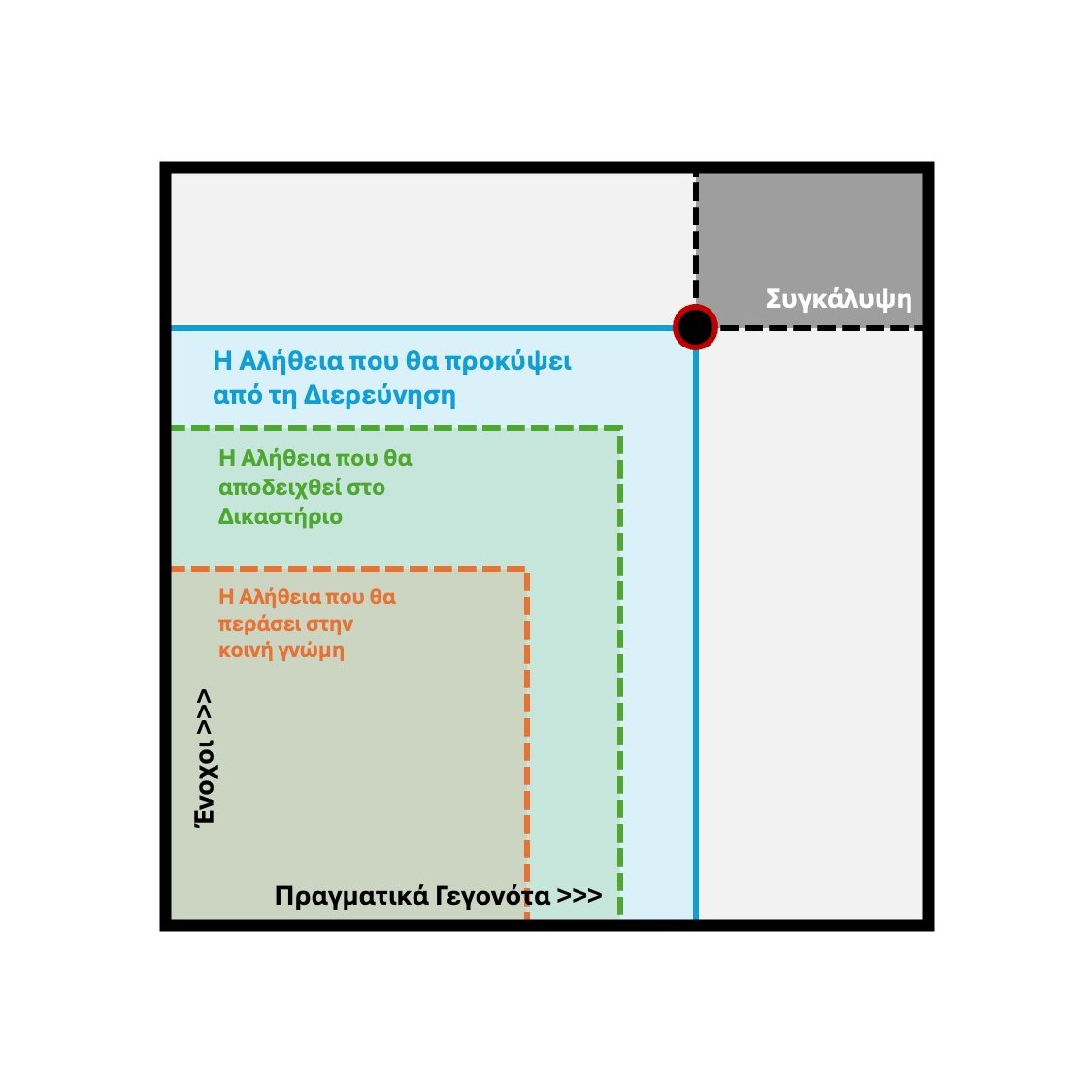 Εάν το γαλάζιο Τετράγωνο φτάσει να καλύψει τα πάντα, φτάσει δηλαδή στην πάνω δεξιά γωνία και έχουν ανακαλυφθεί όλα τα πρόσωπα που ευθύνονται και όλα τα πραγματικά γεγονότα που έχουν συμβεί, τότε έχουμε φτάσει στην πλήρη Αλήθεια. Εάν το γκρίζο Τετράγωνο της Συγκάλυψης φτάσει να πνίξει τα πάντα, φτάσει δηλαδή στην κάτω αριστερή γωνία και δεν έχει βρεθεί κανείς ένοχος και δεν μάθουμε ούτε ένα πραγματικό γεγονός, τότε θα έχουμε φτάσει στην πλήρη Συγκάλυψη. Εάν κάποιος εστιάσει μόνο στο να βρει ενόχους χωρίς να τον ενδιαφέρουν τα πραγματικά γεγονότα, τότε αυτό δεν είναι αλήθεια αλλά Κυνήγι Μαγισσών. Εάν από την άλλη κάποιος εστιάσει μόνο στα γεγονότα χωρίς να ακουμπά τους ενόχους, τότε μιλάμε για ένα μεγάλο Ξέπλυμα Ευθυνών. Η Διερεύνηση πρέπει αναγκαστικά να ισορροπεί μεταξύ Πραγματικών Γεγονότων και Ενόχων.