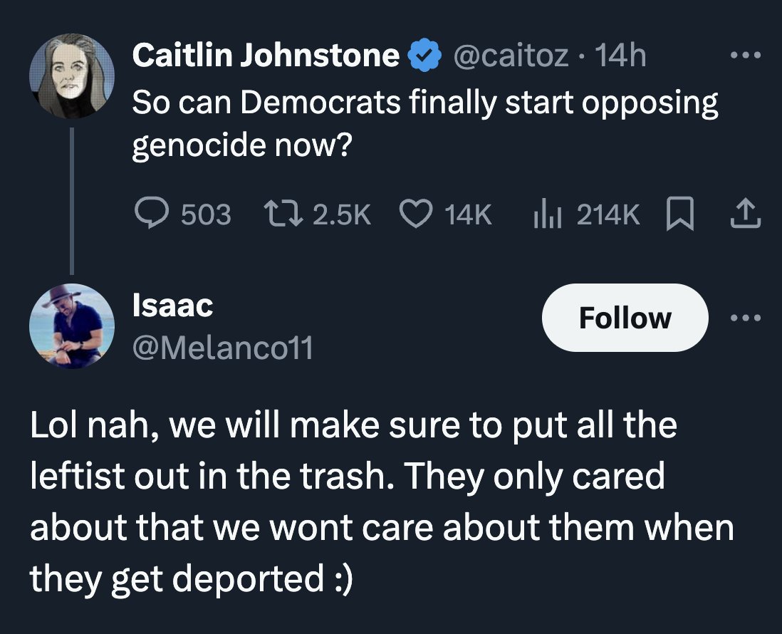 "It just says so much about the state of western civilization that even GENOCIDE has been turned into another vapid culture war wedge issue for people to masturbate their tribal identity constructs on." caitlinjohnstone.com.au/2024/03/08/pre…