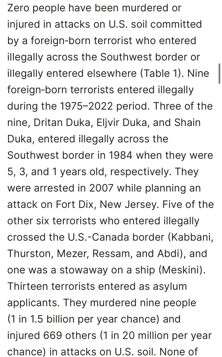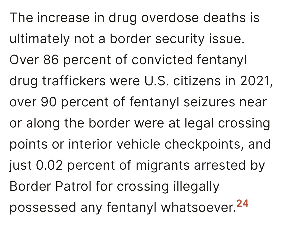 The “security crisis” at the border is a bald lie. there have been zero murders in the US by foreign terrorists who got here through the southern border illegally. secondly, 0.02% of migrants arrested by border patrol have fentanyl to begin with. fentanyl is a domestic issue