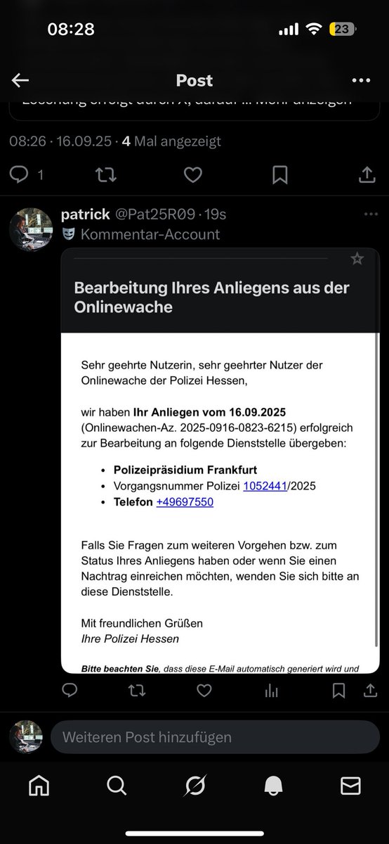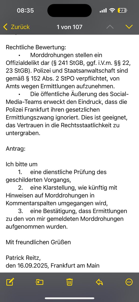 Soeben habe ich neben der zweiten Strafanzeige gegen @RealWuppi auch eine Dienstaufsichtsbeschwerde gegen das Social-Media-Team der @Polizei_Ffm eingereicht.