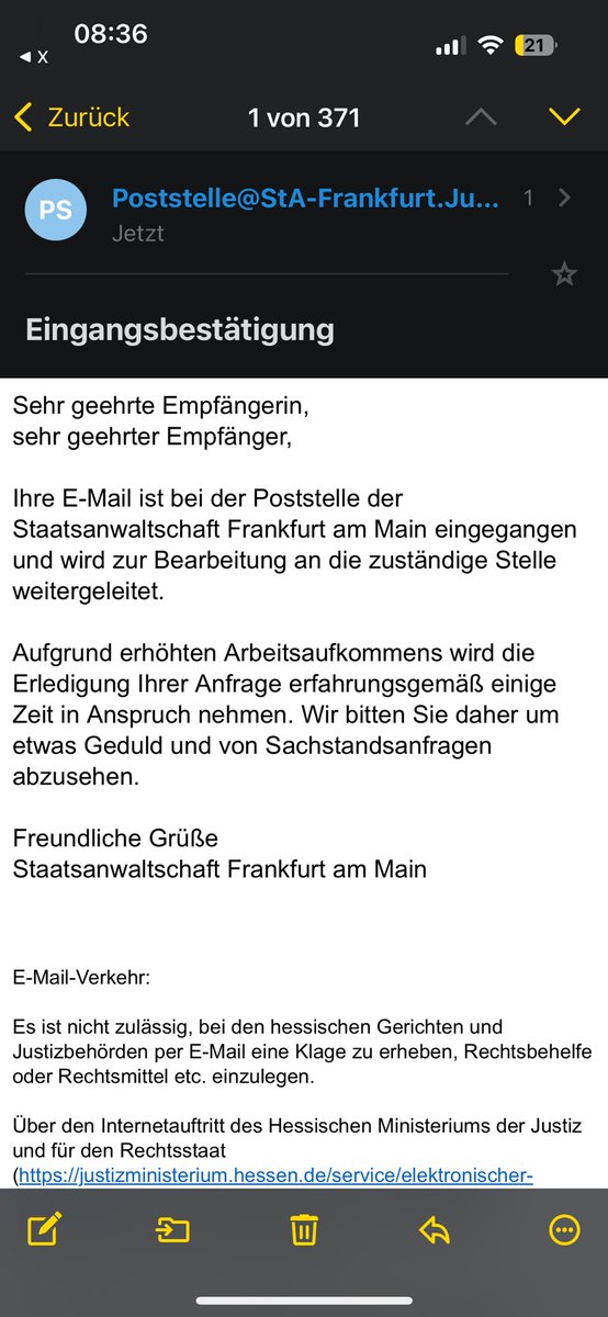 Die Staatsanwaltschaft Frankfurt hat den Eingang bestätigt (E-Mail liegt vor).