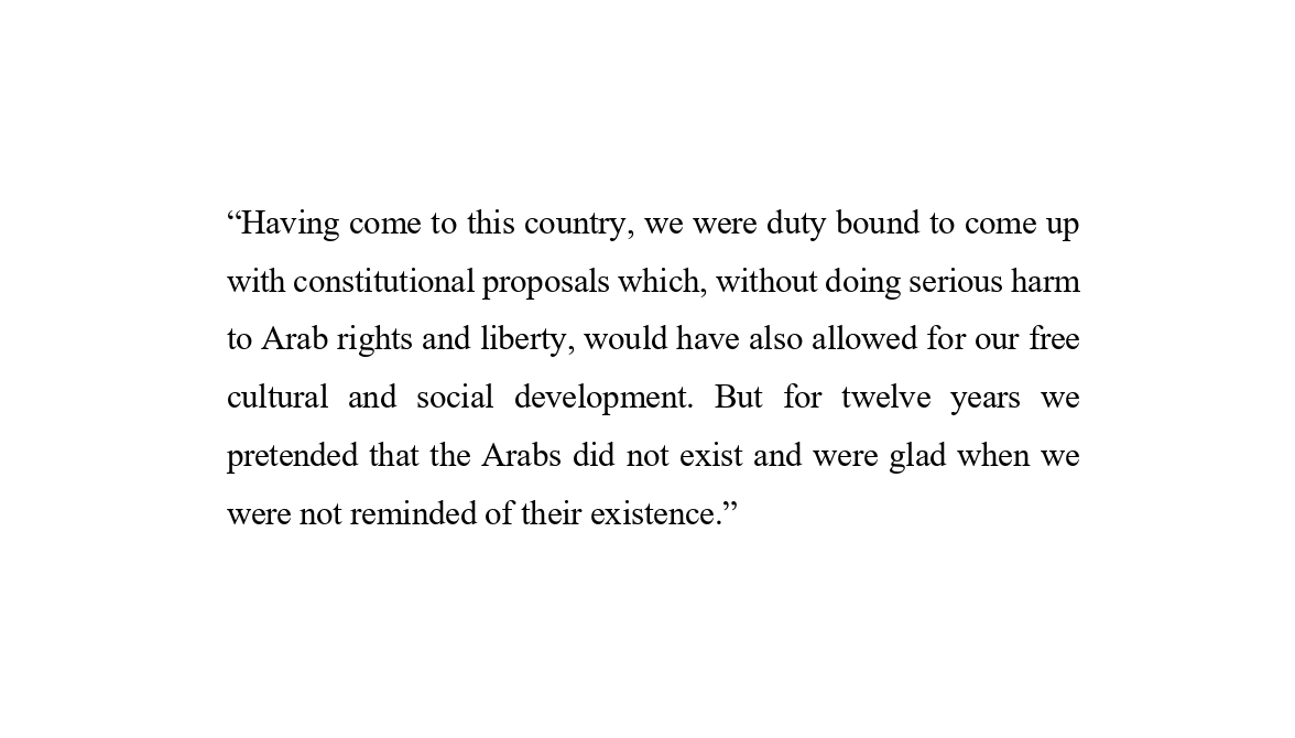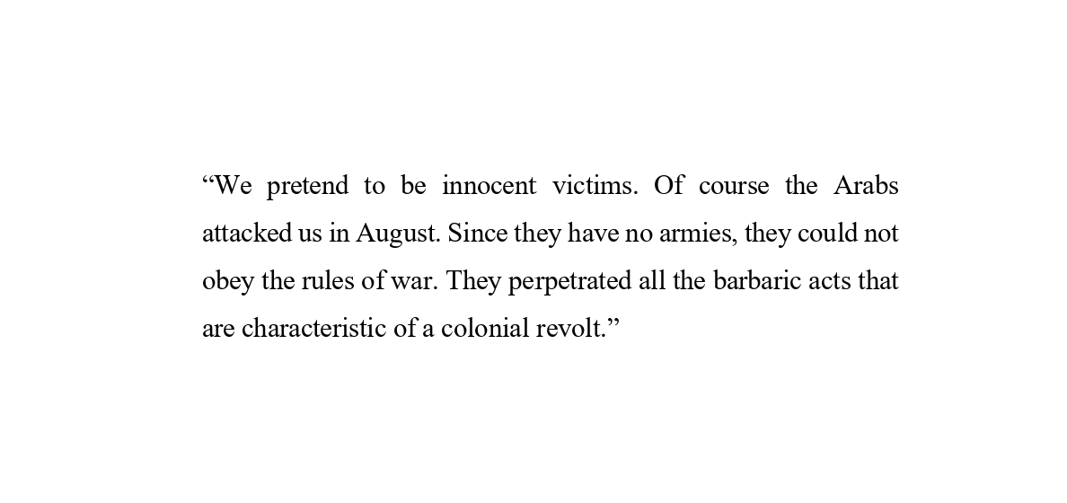 “We pretend to be innocent victims. Of course the Arabs attacked us. Since they have no armies, they could not obey the rules of war. They perpetrated all the barbaric acts that are characteristic of a colonial revolt.”