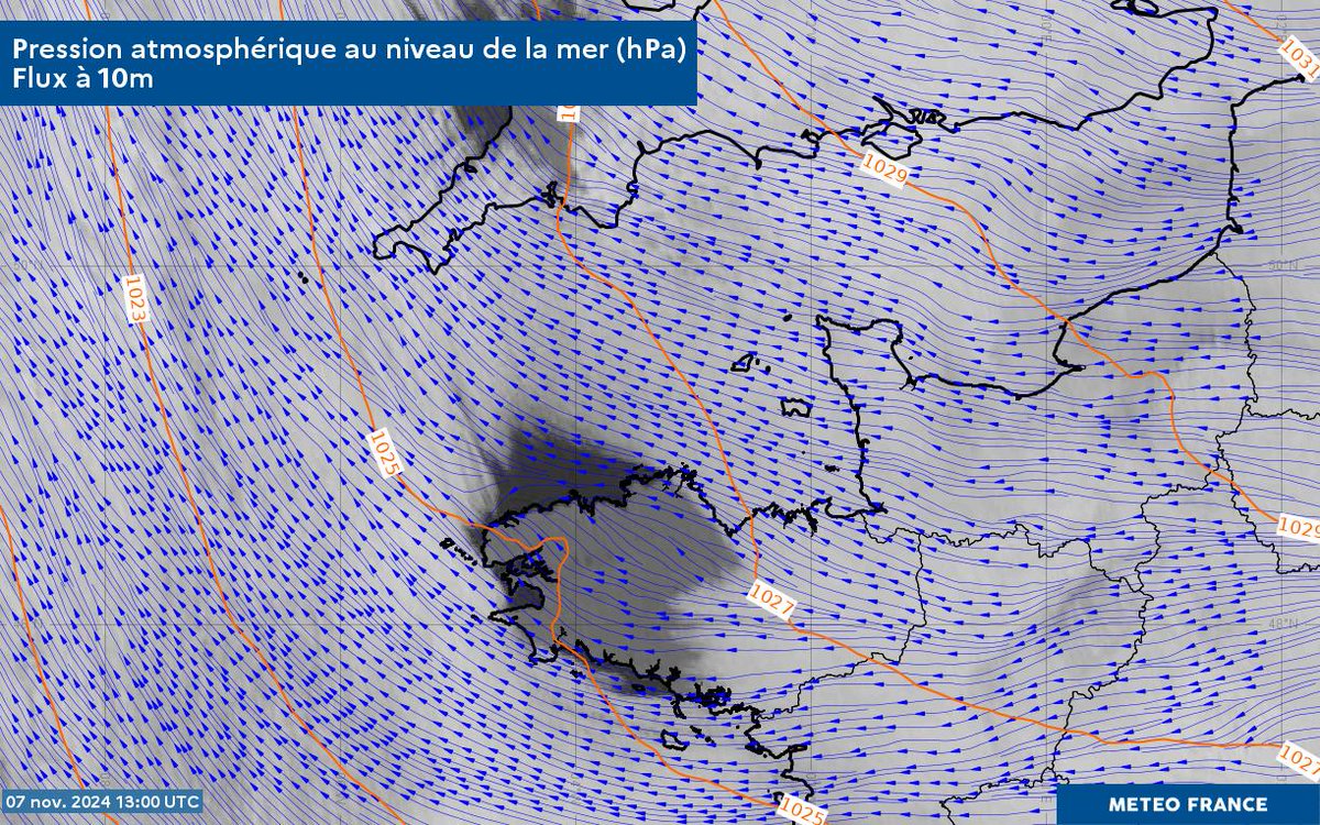 Nos prévisions pour la journée du jeudi faisaient état de cette percée lumineuse dans le ciel breton dès le mardi 5, et s'est confirmée lors des actualisations suivantes de mercredi 6 novembre :