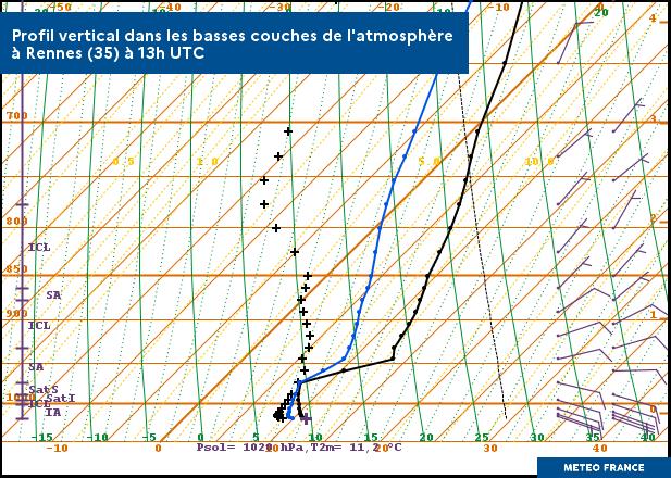 L'humidité dans les très basses couches de l'atmosphère s'est bloquée sur les versants du Massif armoricain exposés au vent dominant d'Est tandis qu'un léger échauffement en aval a suffi a désaturer la mince couche de stratus.