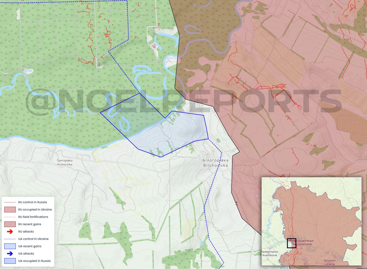 Ukrainian forces recaptured previously lost territory near Bilohorivka, new geolocated footage shows. Previously it was assumed, based on footage, that Russians had established control over a part of the SD-river but this was reverted by Ukrainian forces.