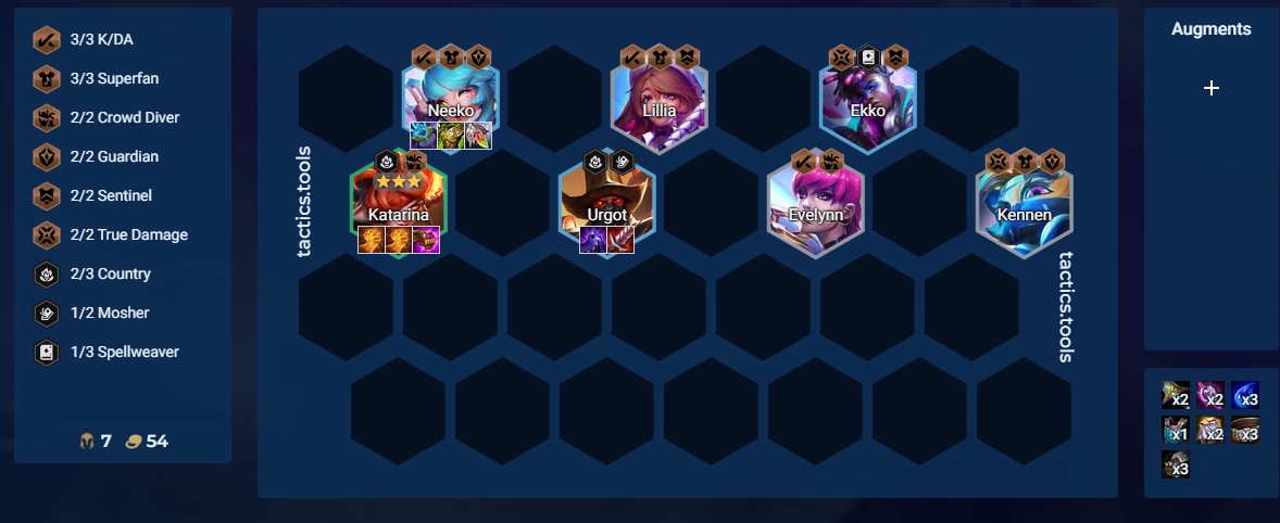 This one is no surprise, its THE strongest comp in the game. Requires very little gold, very stable on Kalista 1 and Rakan 1, and has high win-con. Very good matchups into most comps. You should force it whenever you have a guinsoo or bow opener. It's also a comp you can fall back on if your opener sucks, just take econ augment and full open, bow on carousel, into 4-2 roll down.
