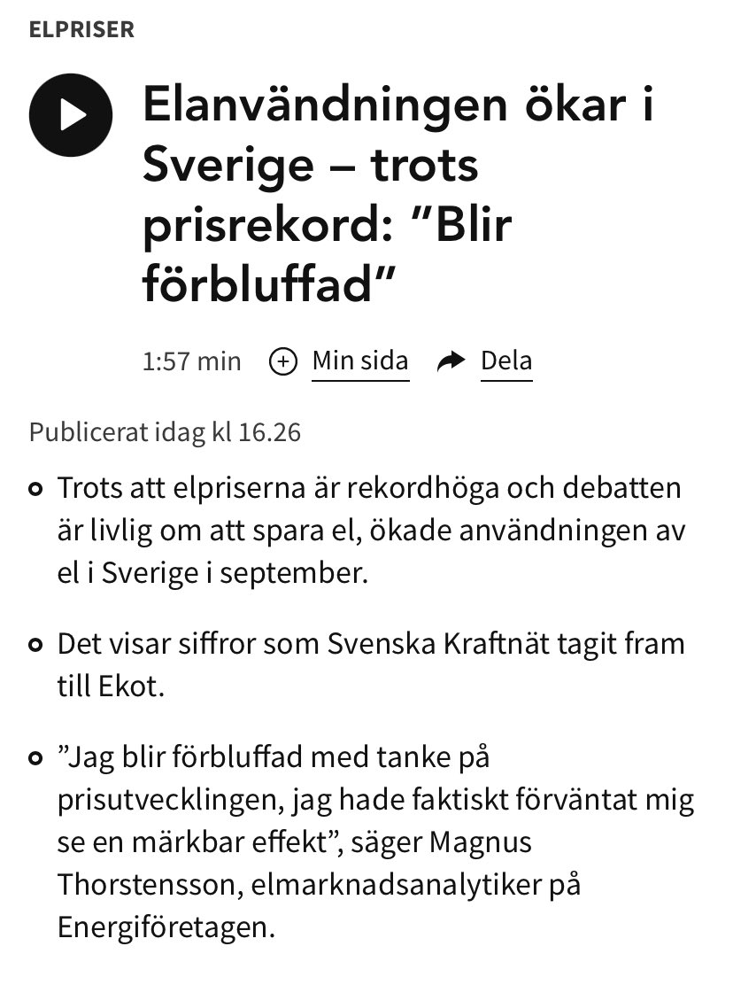 Ekot rapporterar att elförbrukningen ökar i september 2022 i jämförelse med september 2021. Experterna kliar sig i huvudet. Vill folk inte spara el? 🧵