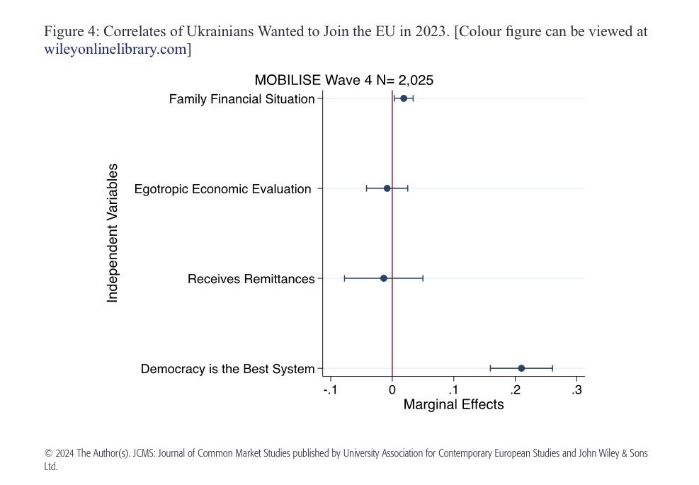 Looking at Ukrainians in 2019 - being a democrat = the strongest predictor of the desire to join the EU, increasing the likelihood by 15 percentage points at 99% sig level.