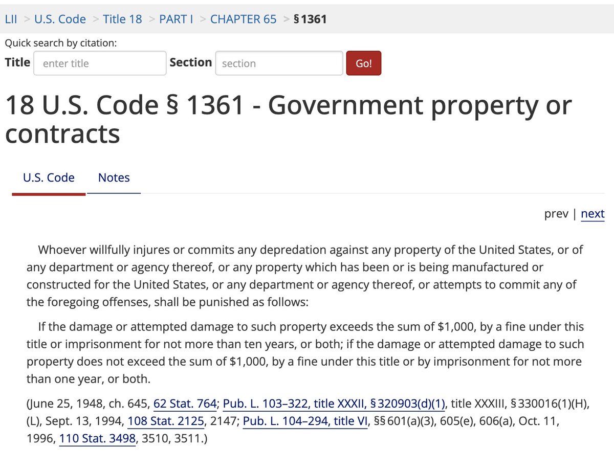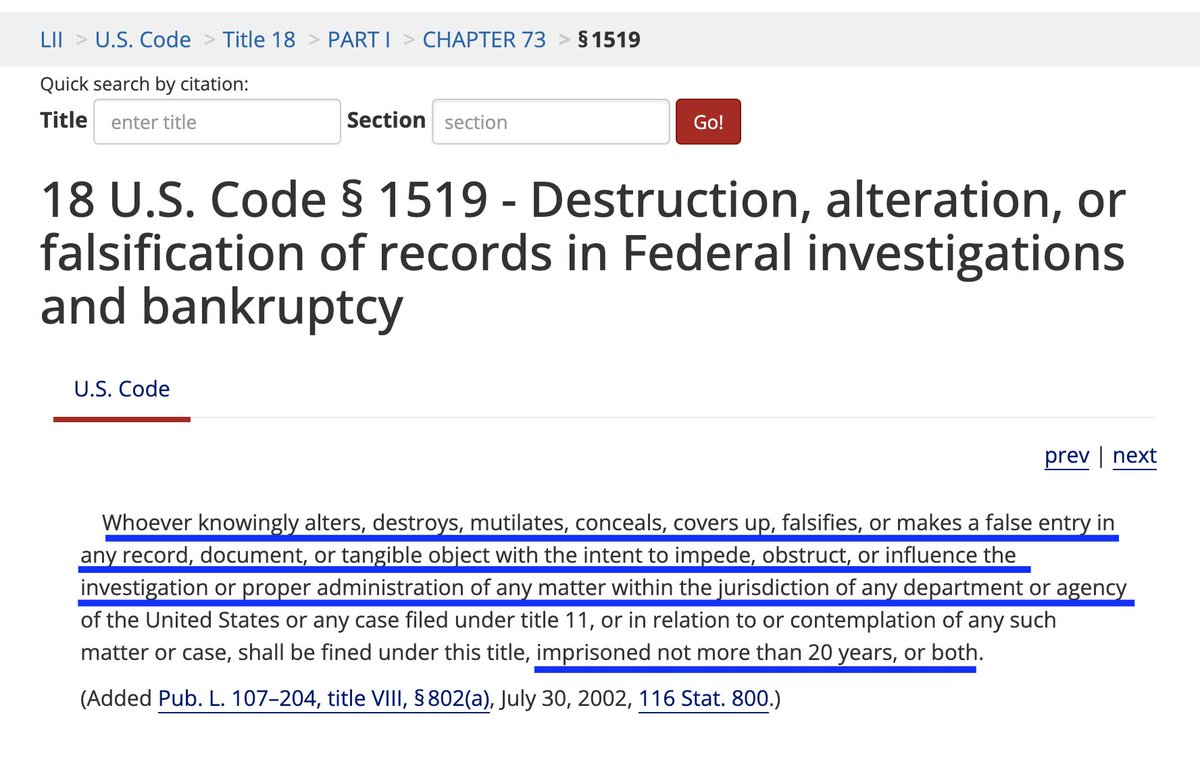 "Whoever knowingly alters, destroys, mutilates, conceals, covers up, falsifies, or makes a false entry in any record, document, or tangible object with the intent to impede, obstruct, or influence the investigation or proper administration of any matter within the jurisdiction of any department or agency of the United States or any case filed under title 11, or in relation to or contemplation of any such matter or case, shall be fined under this title, imprisoned not more than 20 years, or both." law.cornell.edu/uscode/text/18…