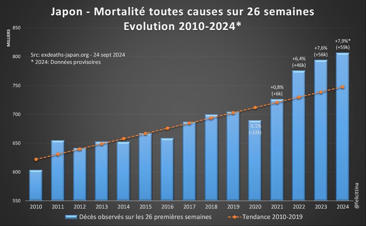 🇯🇵 #Japon 1. Que faire quand un organisme officiel comme publie les chiffres de #mortalité visibles sur ce graphe tout en prétendant que l'on a pour le premier semestre 2024, une sous-mortalité de -2,7% (22,5k décès de moins que ce qui était "attendu")⁉️ exdeaths-japan.org
