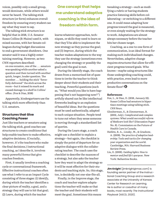 - Coaching to support teachers must be adaptive—but it’s not always treated as such. “The most common failure in leadership is produced by treating adaptive challenges as if they were technical problems”