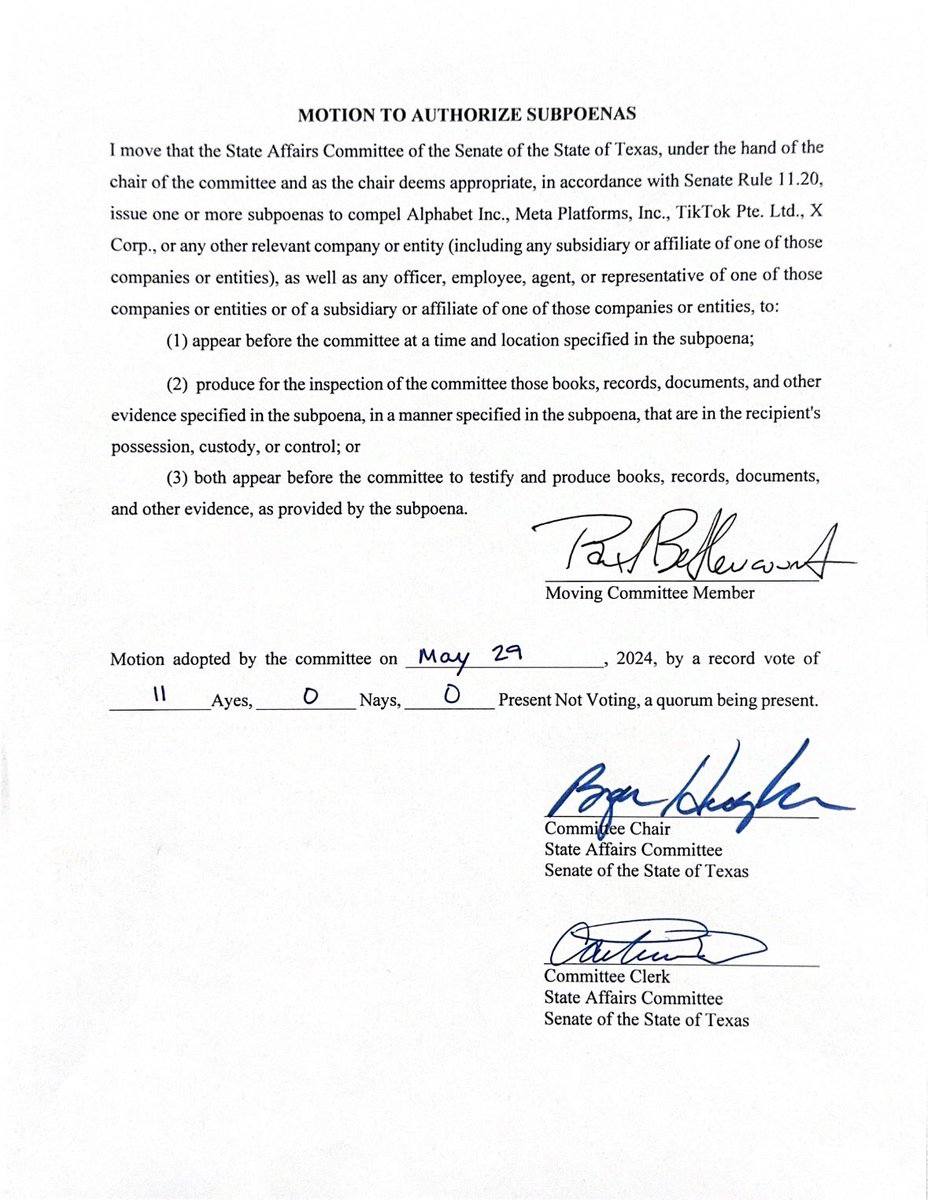 Following the testimony of Google Whistleblower Zach Vorhies (@Perpetualmaniac), in a unanimous vote, the Senate Committee on State Affairs has authorized subpoenas to big tech firms like Facebook and Google. 📋