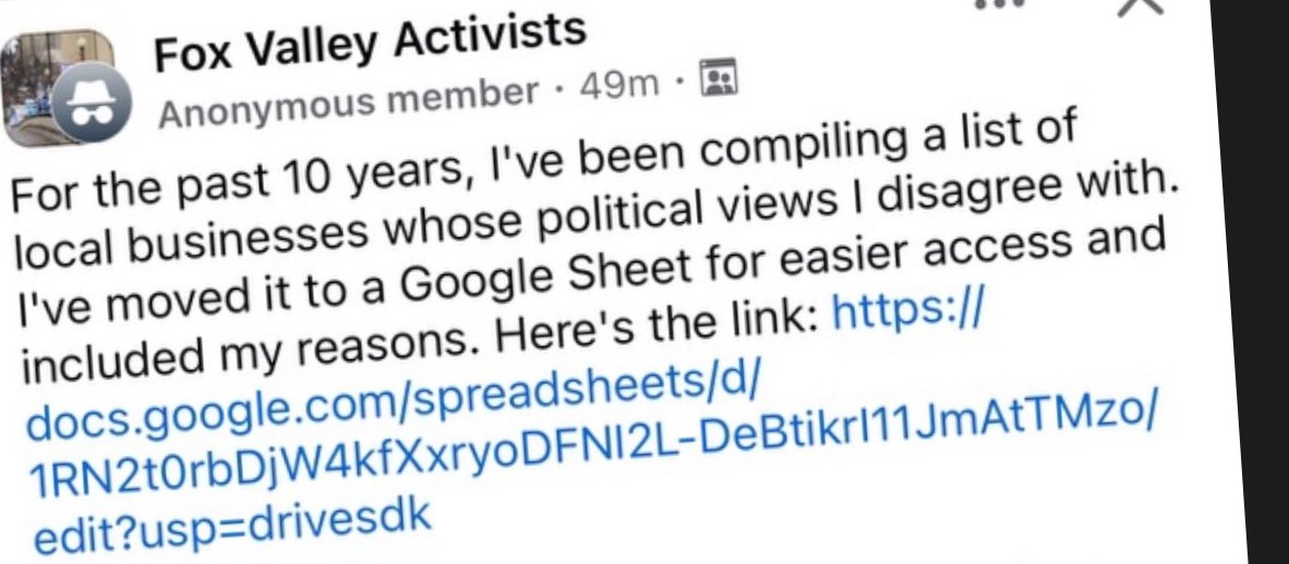 2/ @Awake_IL has blown the lid off this SHOCKING scheme. A Facebook group called “Fox Valley Activists,” run by local elites, is trying to boycott businesses for supporting MAGA. This is nothing short of a coordinated attack to CANCEL anyone who doesn’t bow to their agenda.
