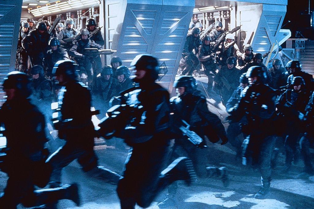 Heinlein’s Troopers have power armour which allows them to jump hundreds of feet in the air – Jon Davidson said budgetary restrictions prevented this being included in the film.