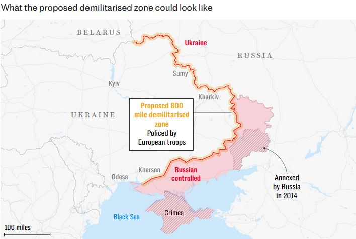 L’un des plans qui semble se mettre en place serait de céder l’ensemble des territoires conquis par les forces russes et de mettre une zone démilitarisée qui serait, potentiellement, sécurisée par les Britanniques, les Allemands et les Français.