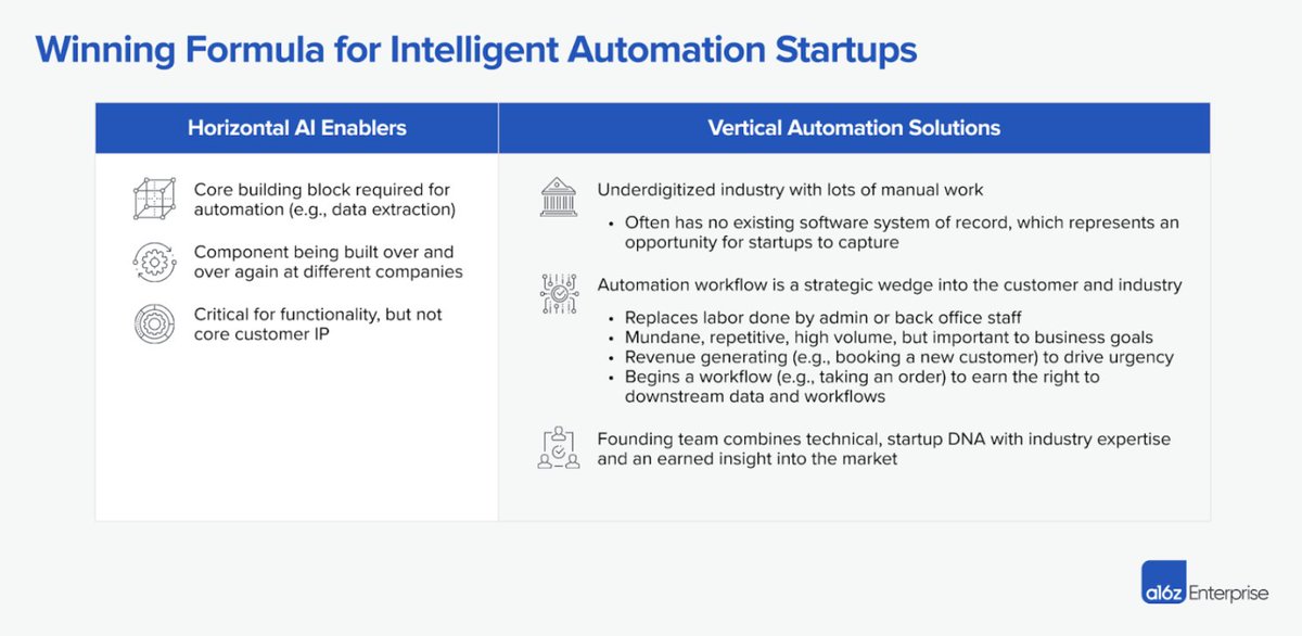 7/ This is our @a16z formula for starting an intelligent automation startup. We believe there are many large businesses to be built here and would love to chat with founders working in this domain!