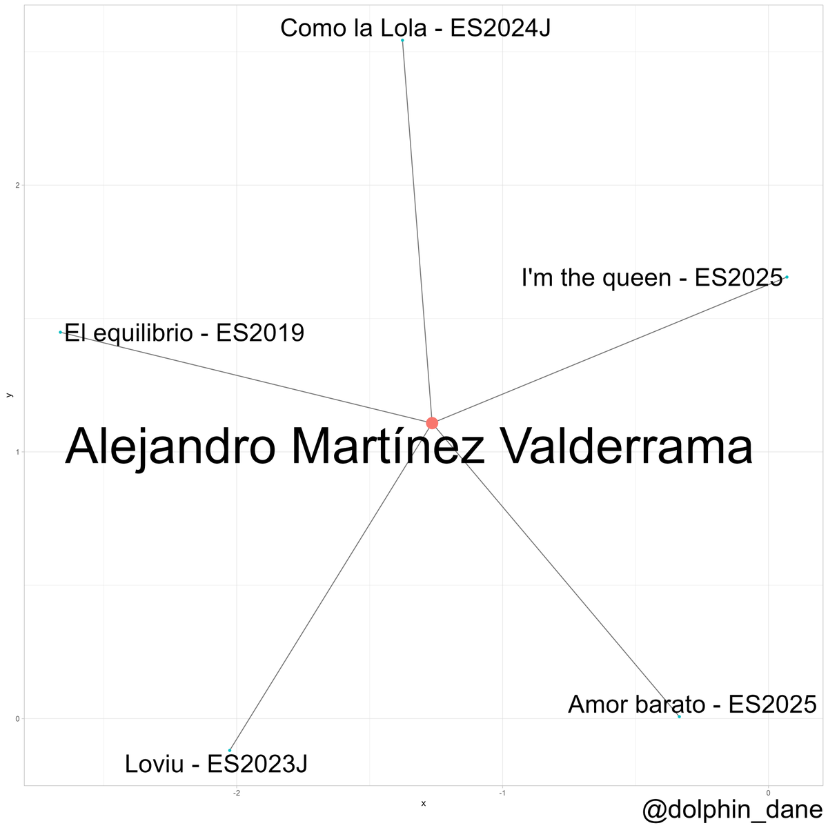 A fun little detail of Eurovision history. This graphs shows all Eurovision/National Final/Junior Eurovision entries ever, connected by their common songwriters. You see the small grey "tail" at the top left, only thinly connected to the rest of the network? (1/6)