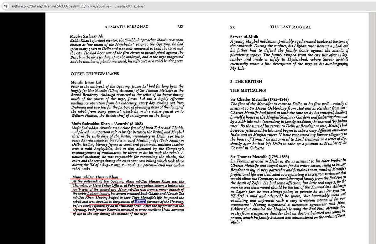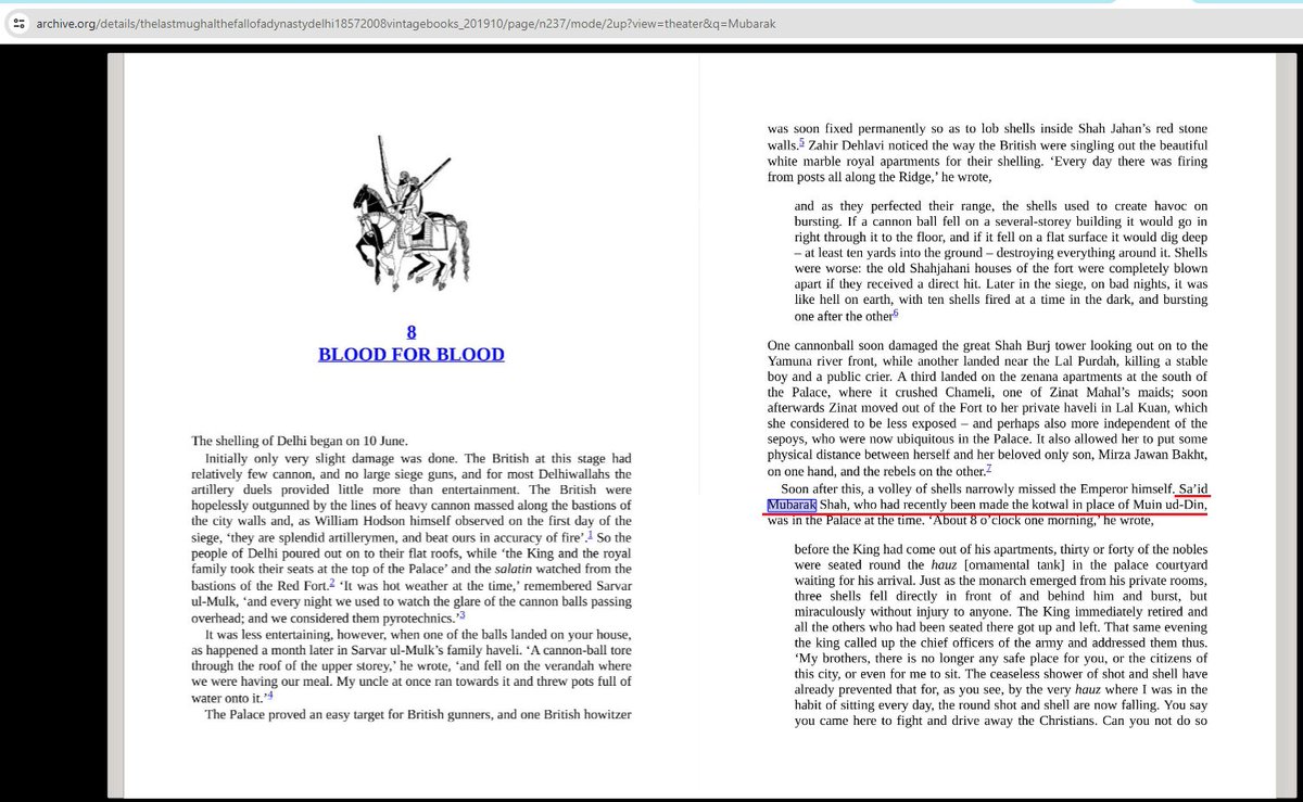 11. This book also confirms that Saiyid Mubarak Shah Khan was the last Kotwal of Delhi. He was appointed as Kotwal after replacing Muin ud-Din Husain Khan!