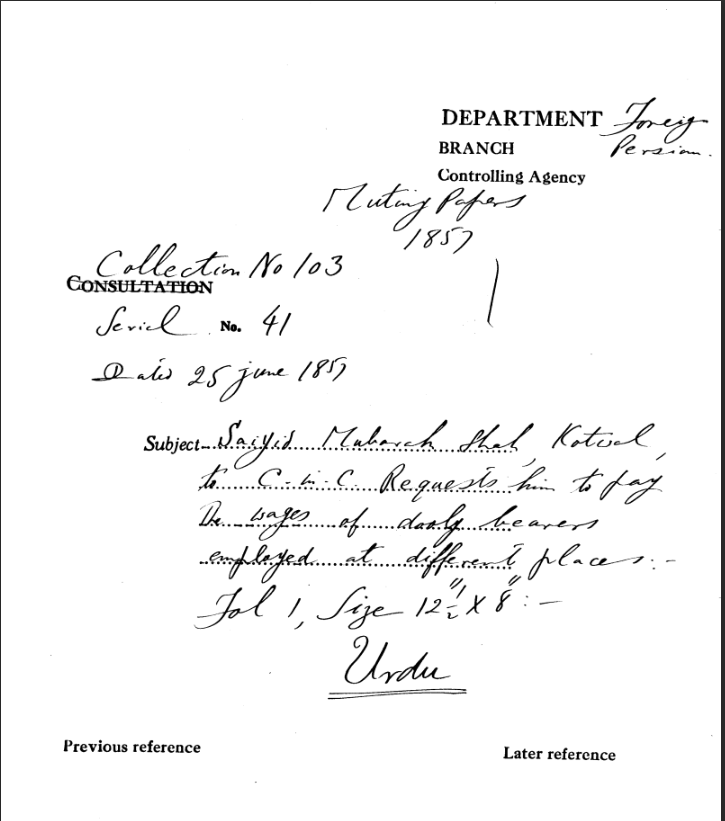 7. I found another document from June 1857, in which Saiyid Mubarak Shah Khan, Kotwal of Delhi, wrote an order.