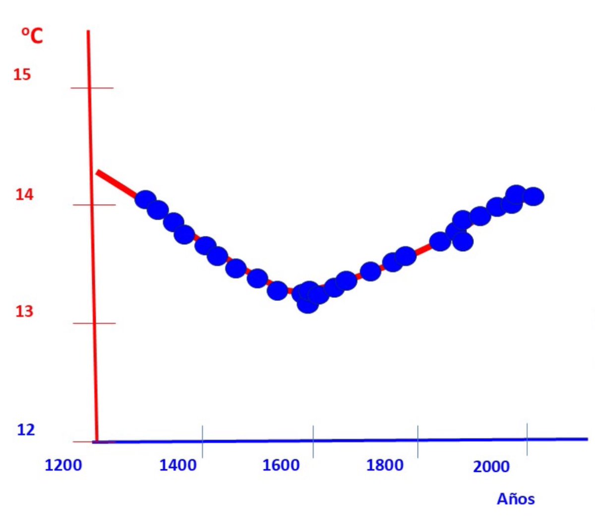 En la gráfica adjunta, la línea roja representa la evolución de la temperatura desde el año 1200 hasta la actualidad, mientras que los círculos azules señalan el momento en que se produjeron las 27 riadas antes mencionadas.