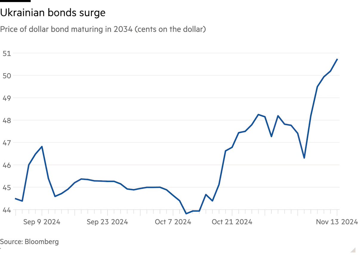 Ukrainian euro bonds jumped[after Trump election] from 44 to 49 cents on dollar, with GDP warrants climbing even more sharply as markets price in peace prospects 2/
