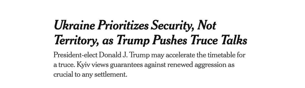 NYTimes writes that Ukraine is shifting focus from territorial control to security guarantees. Here in Kyiv, I agree. The Trump election is a wake up call for many, including me, to reassess our options. 1/