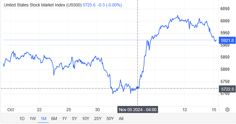 While stocks popped 5% on the election news, the recent selloff means we're at levels only about 1% above the pre-election week levels.