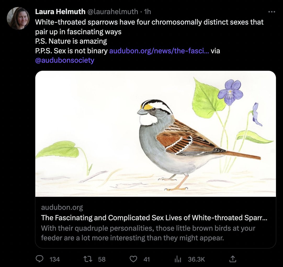 @sciam She once absurdly claimed that white-throated sparrows had 4 sexes. When I corrected her on this point, she blocked me.