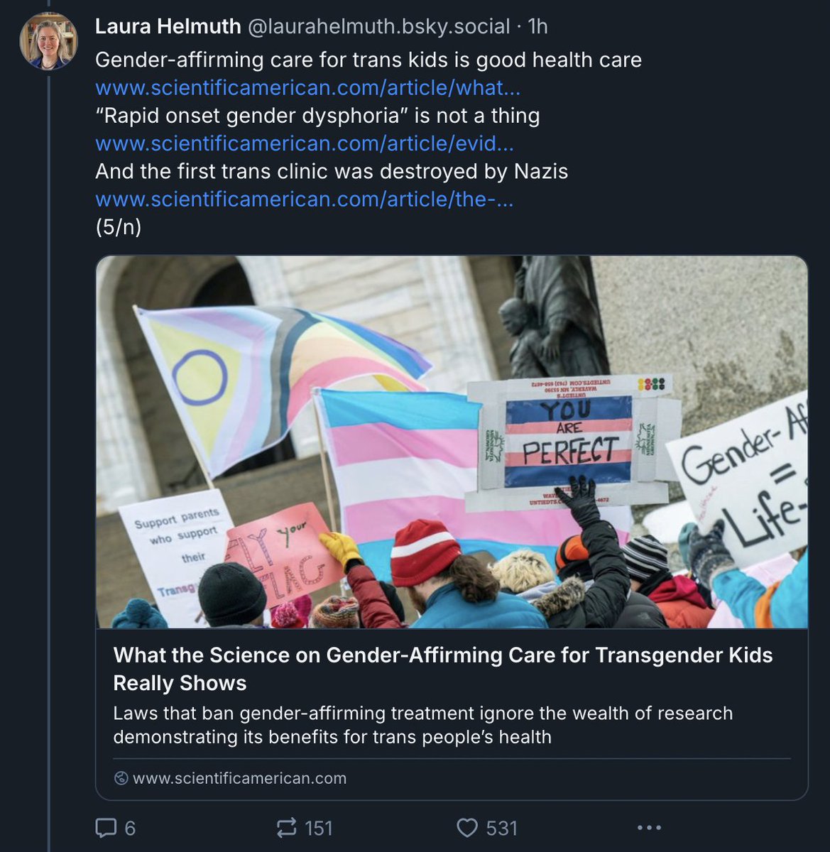 She claims that "gender-affirming care for trans kids is good health care," despite every systematic review stating otherwise.