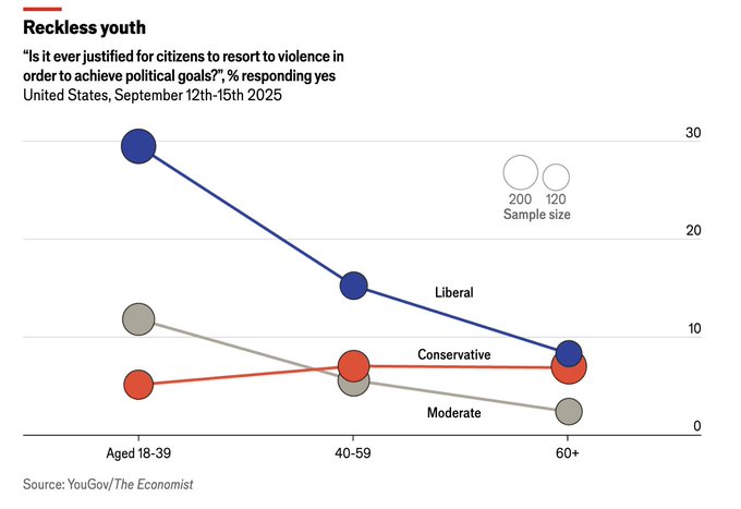 The first graph is recent and relates to the Kirk killing. About 30% of liberals in their 20s & 30s are fine with the violent deaths of their political opponents. They are truly a generation of bloodthirsty vipers.