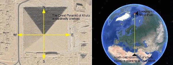 هرم بزرگ (منسوب به خوفو، حدود ۲۵۵۰ پیش از میلاد) تنها ۳.۴ دقیقه قوسی از تراز کامل با شمال حقیقی انحراف دارد. این به معنای دقتی در حدود ۱ میلیمتر در هر متر از طول پایه آن است.
