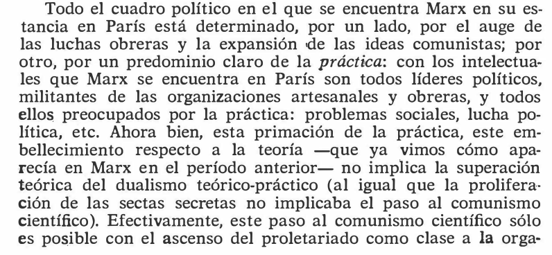 Es el pensamiento de una clase y no de un hombre, entonces, lo que se plasma en Marx, que en su búsqueda por la universalidad se percata de formar parte de un sujeto social práctico que clama por su emancipación de toda la historia: el proletariado revolucionario. (12/25)