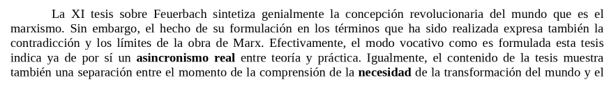 No obstante, en su tesis Marx escribe, casi exigiendo, la transformación del mundo, es decir, escribe partiendo de la premisa de que los descubrimientos que ha logrado realizar y proyectar desde su pensamiento no cobran materialidad inmediata, no se realizan prácticamente:(13/25)
