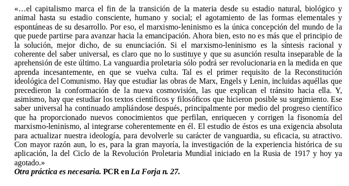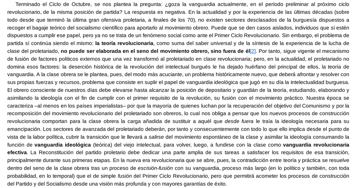 Por todo esto la tarea de construcción de cuadros comunistas se vuelve la tarea de nuestra época, donde la formación de teóricos obreros sea la tarea principal de la vanguardia hoy en día, pues todo desarrollo intelectual debe estar vínculado a la reconstitución de ese (23/25)
