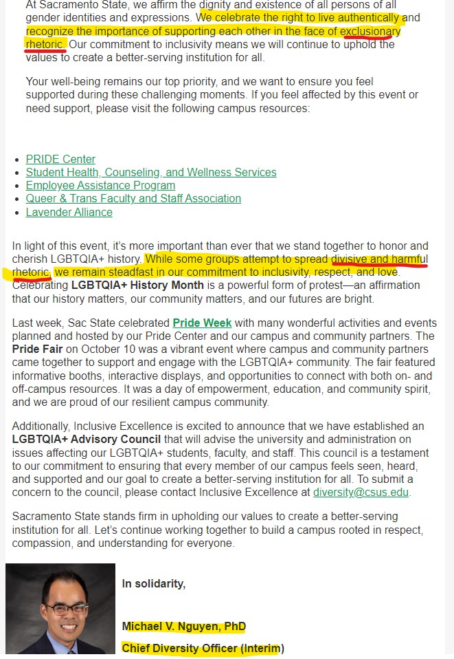 ✅ Pronoun rituals and "preferred name" encouraged by the Sac State Queer Trans Faculty and Staff Association (QTFAS)
