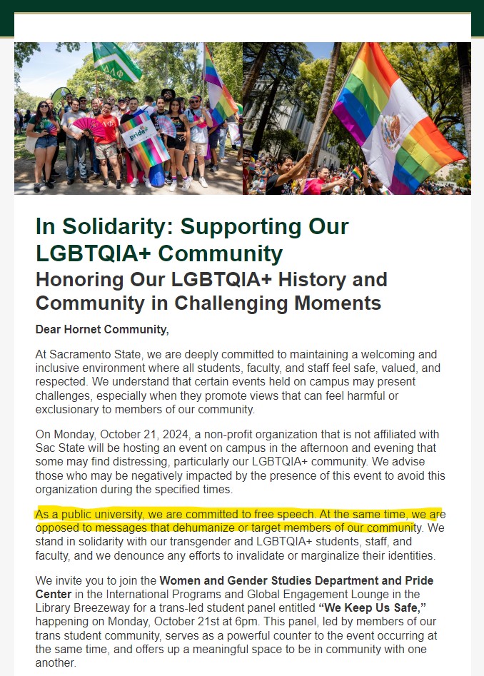 2/ Two gender-critical Sac State professor friends of mine leaked this memo to me in response to tonight's @TPUSA event with Chloe Cole.