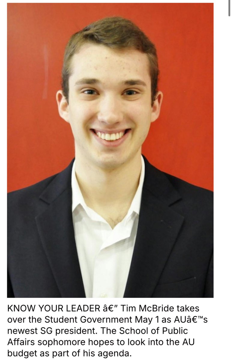 As student body president, McBride worked to progress the LGBT agenda on campus. She worked within student government to establish gender-neutral housing for first-year students, and helped create an LGBT and queer studies minor.