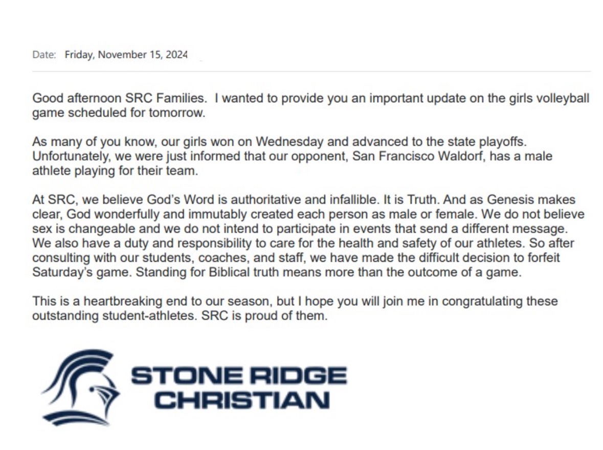 Stone Ridge Christian High School girls volleyball team will forfeit tomorrow's game against San Francisco Waldorf with male player Henry Hanlon rather than risk their team's safety.