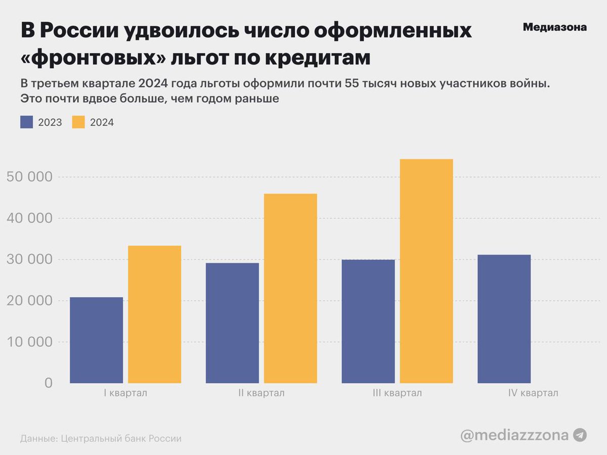 El reclutamiento de voluntarios rusos para participar en la guerra continúa a un ritmo récord, según datos del Banco Central sobre vacaciones de crédito para el personal militar informa Mediazona. Estas estadísticas se refieren a las vacaciones de crédito, que son tomadas principalmente por nuevos participantes en la guerra: no se puede obtener un aplazamiento para un préstamo recibido después de haber sido enviado al frente. Vacaciones crediticias = nuevo soldado.