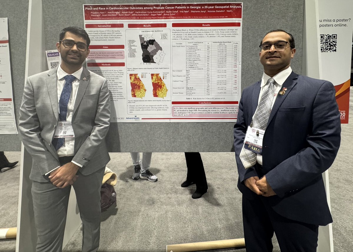 Our final poster for #AHA24 presented by @NainPriyanshu on behalf of our team from @GACancerCenter and @WinshipAtEmory: Place and Race in Cardiovascular Outcomes among Prostate Cancer Patients in Georgia: a 20-year Geospatial Analysis - we used Georgia DPH data to do this analysis with excellent Geospatial modeling by Manali Rupji
