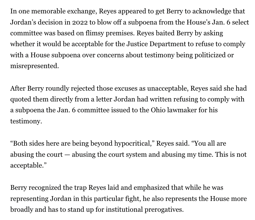 NOTABLE: Reyes trapped House counsel Matthew Berry into appearing to concede that Jim Jordan's public reasons for blowing of the Jan. 6 committee's subpoena were not acceptable. politico.com/news/2024/10/2…