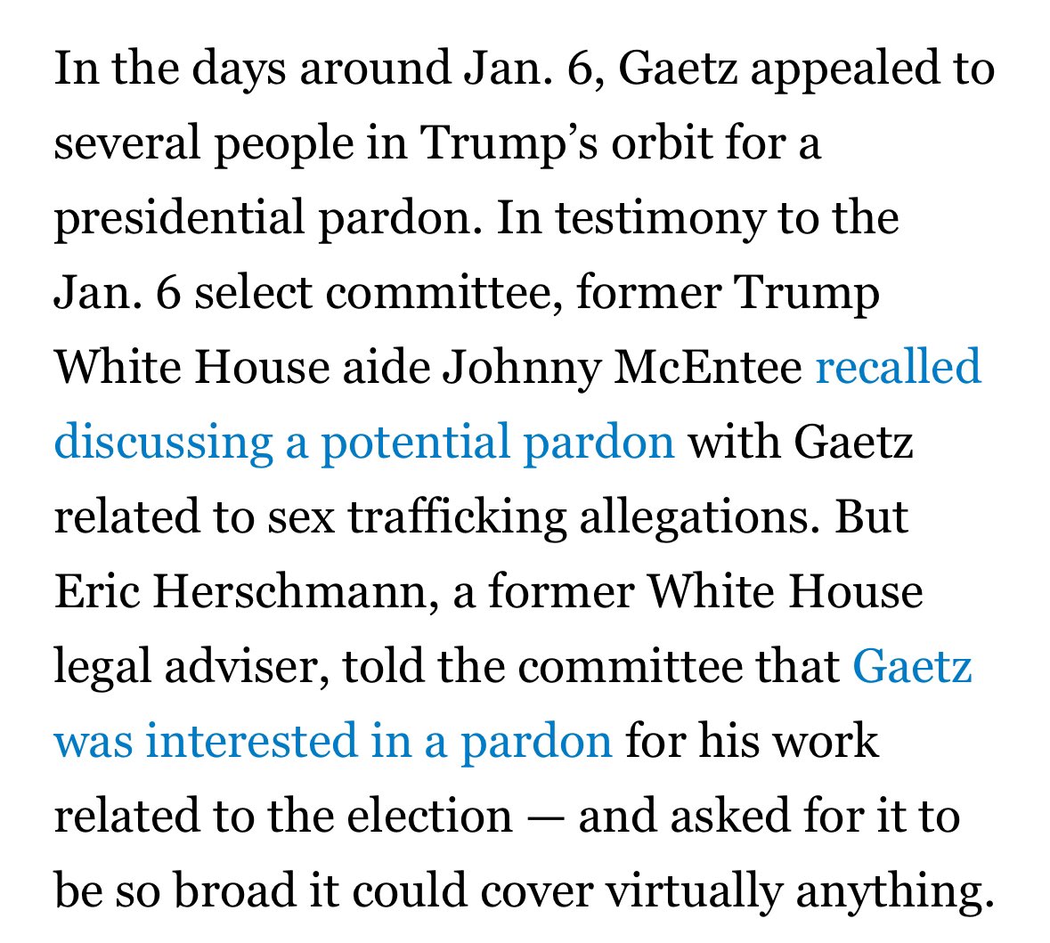 GAETZ would later ask repeatedly for a pardon, one Eric Herschmann described as so broad and unbounded it would be unworkable. politico.com/news/2024/11/1…