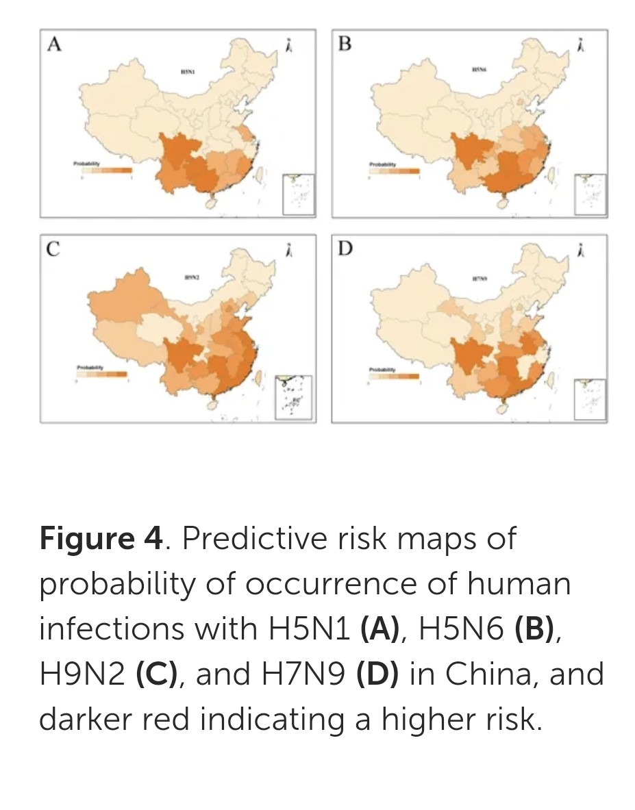 7) ... high-risk regions for each virus. This information can help guide targeted disease surveillance and control efforts in China. This study demonstrates the complex interplay of ecological, environmental, and factors that shape the spread of different avian influenza viruses.