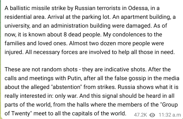 On his Telegram channel, President #Zelenskyy reacts to the latest tragedy.